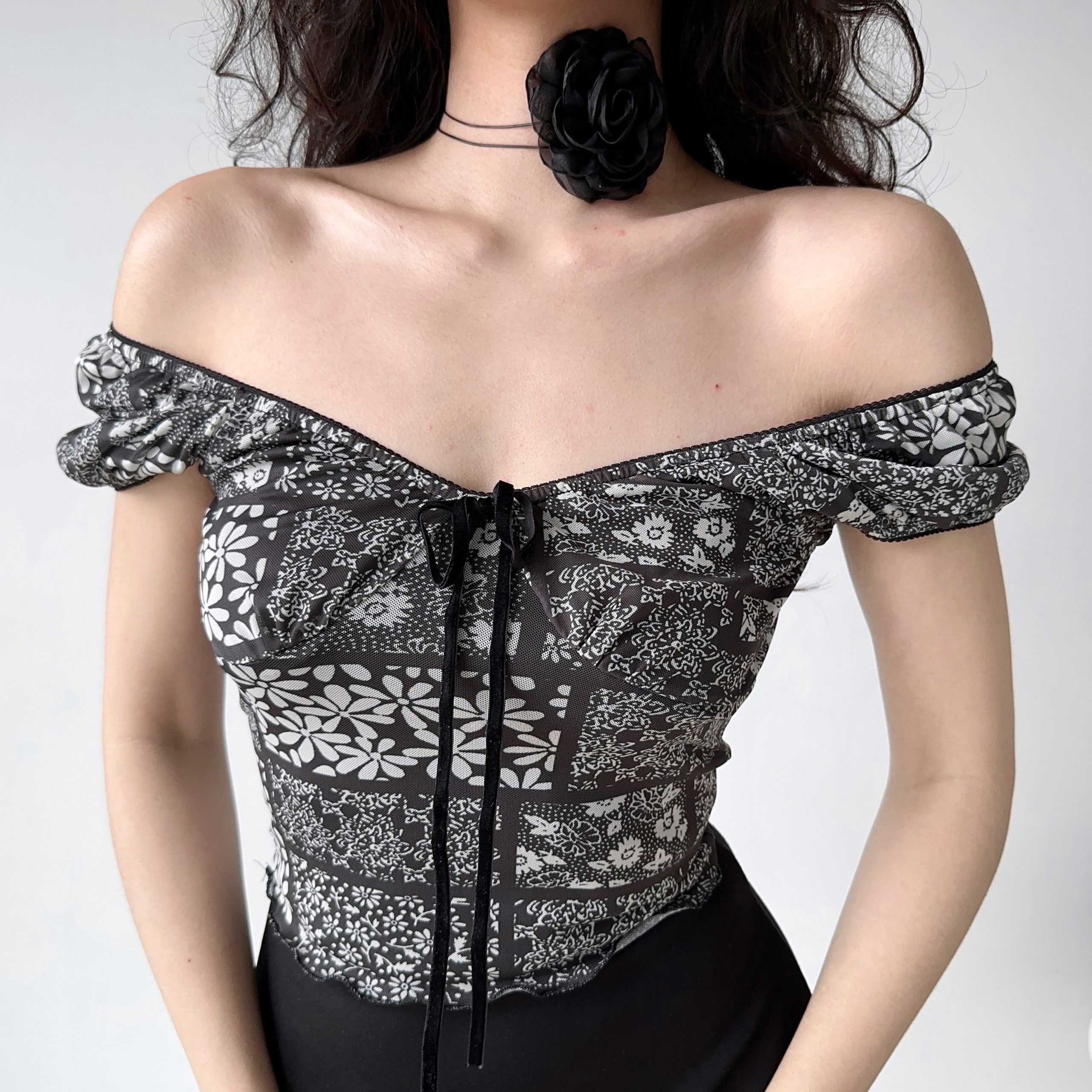 Retro Deep V Black Floral Short Sleeve T-Shirt for Women – Summer Puff Sleeve Top in European and American Style