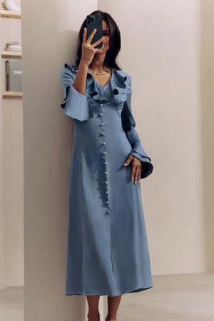 French Blue Satin Dress High-end Ruffled Mid-length Fitted Waist Flare-sleeve A- Line Skirt