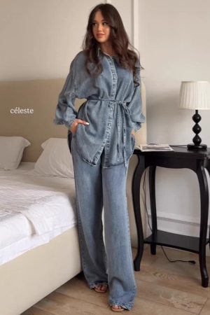Fashionable Shirt-buttoned Tie-waisted Loose Jacket Denim Suit For Women