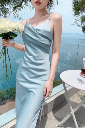 French Style Blue Sling Dress Women’s Summer Satin