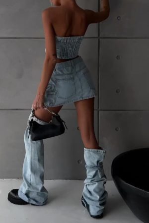 Light Blue Denim Corset Top And Cargo Pant Set With Distressed Details