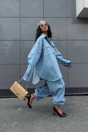 Light Blue Denim Oversized Shirt And Baggy Pants Set