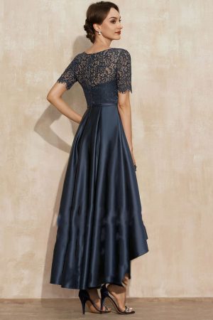 Navy Blue Satin Ball Lace Short Sleeve Dress