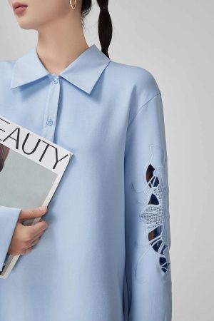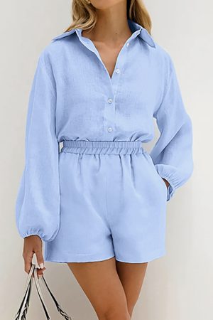 Loose Blue Cotton Long-sleeved Shirt And Shorts Two-piece Set