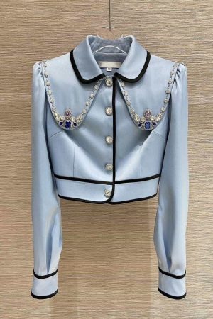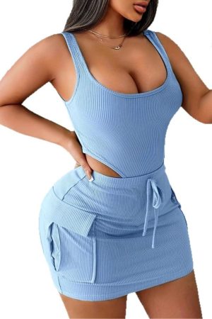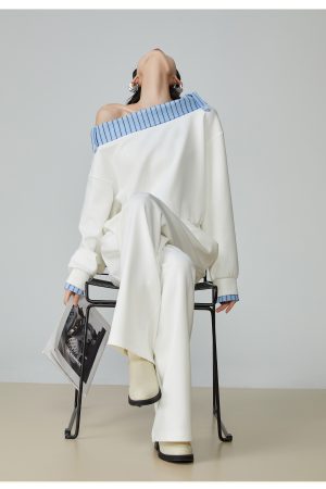Two Piece Set Of Blue And White Striped Collared Sloping Shoulder Hoodie And Wide Leg Pants