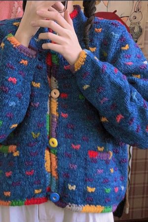 Women’s Loose Blue Embroidered Knit Cardigan Jacket