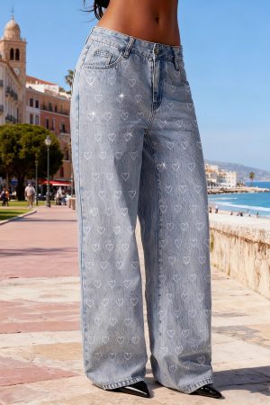 Womens Blue Straight Jeans With A Sweet Rhinestone Design