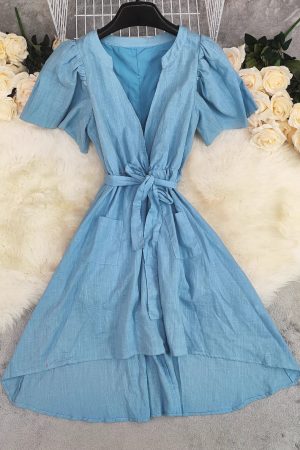 Womens Blue High-waisted Short-sleeve Lace-up Dress