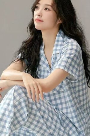 Women’s Summer Cotton Short-sleeved Japanese Style Plaid Loose-fit Plus Size Outfit Suit