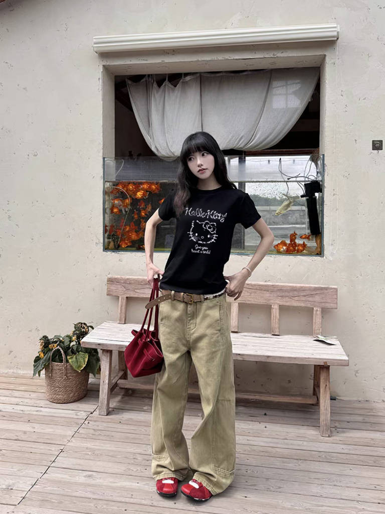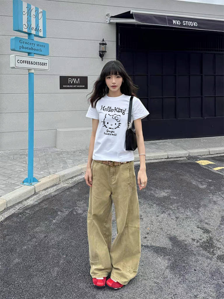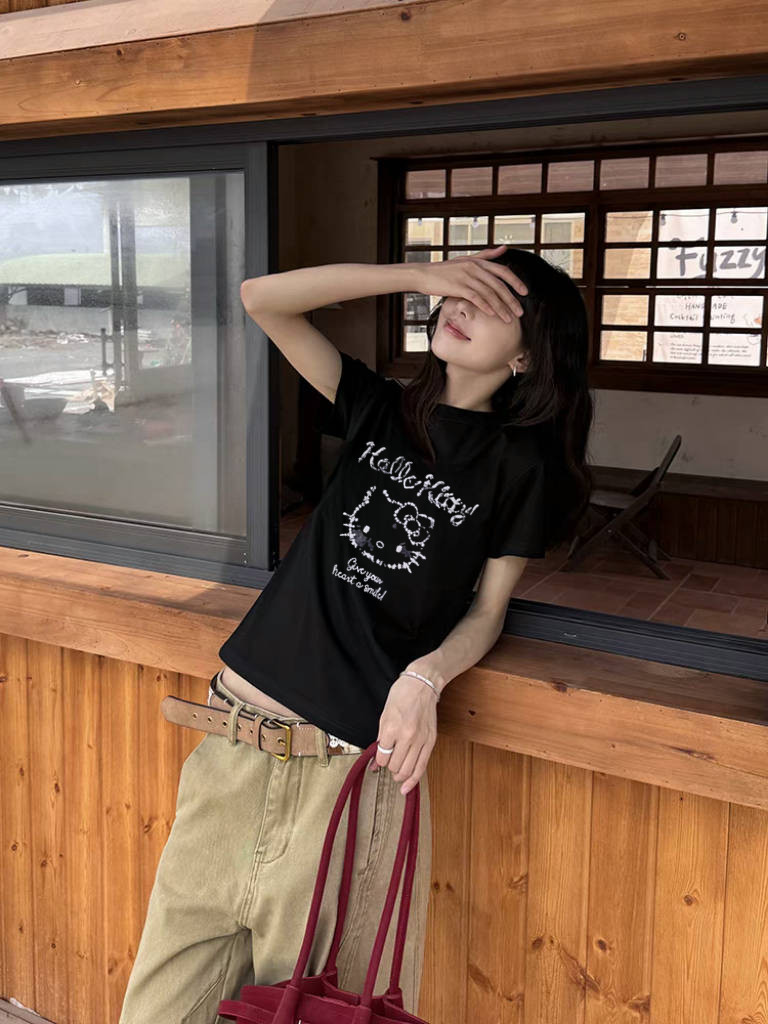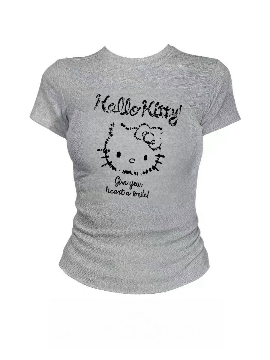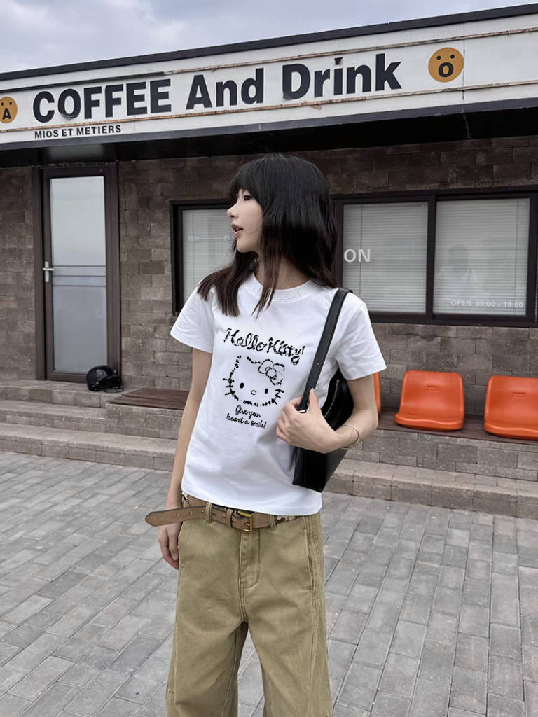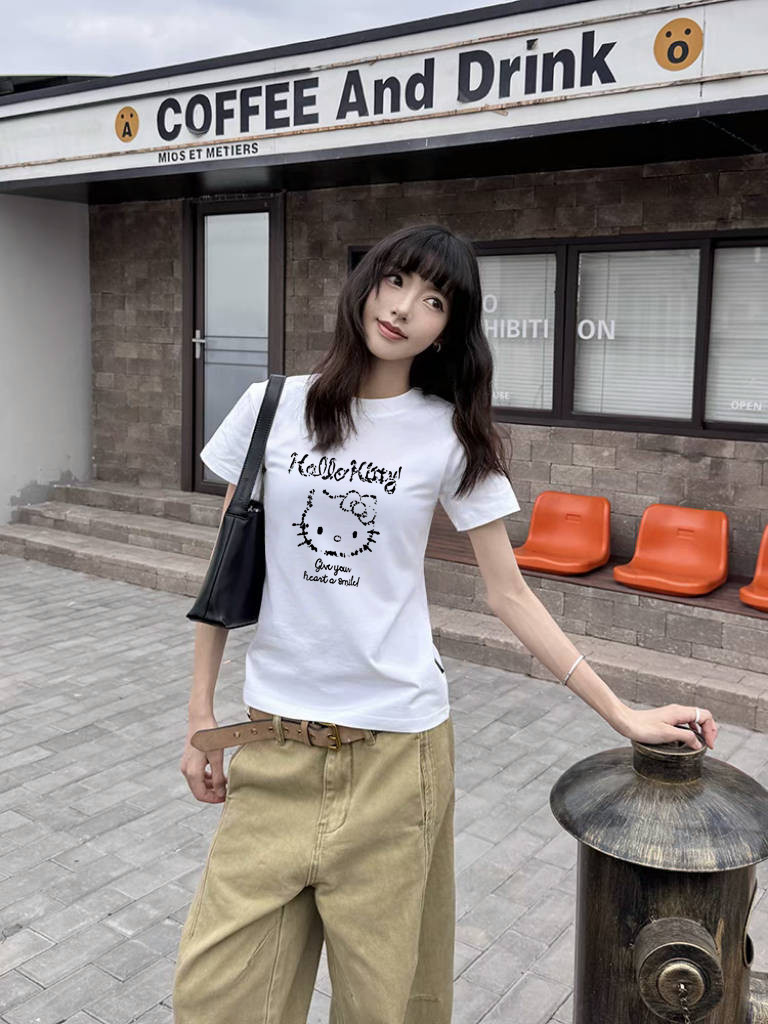 Retro Hello Kitty Cartoon Printed Short Sleeve Women Slim Fit Summer, F – Summer Fits
