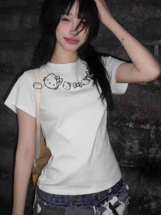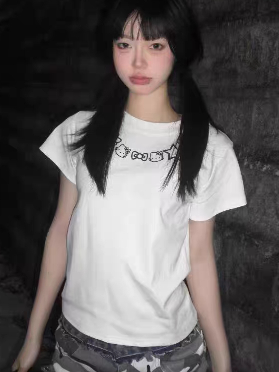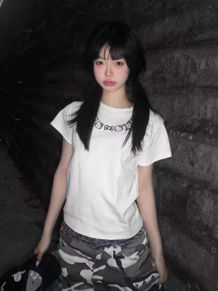 Retro Kitty Cat Print White Short Sleeve Women Summer Slim Fit Top, Y2K High-quality product featuring summer fits, easy halloween costume, fall fits and more. Modern design that fits the latest trends. Premium materials ensure durability and comfort. Order now for special offers! Product designed with attention to every detail. Suitable for all occasions and personal styles.