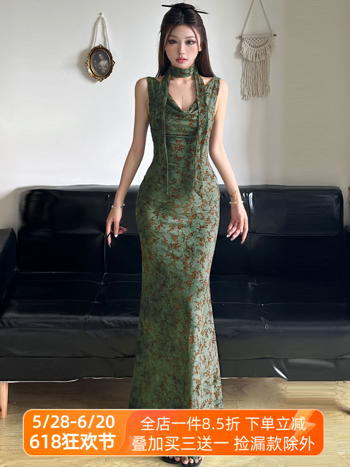 Charm Green Pine Fish Tail Long Dress Women Flowing Collar, Body Hugging High-quality product featuring fall outfits women, thanksgiving dress, christmas dress and more. Modern design that fits the latest trends. Premium materials ensure durability and comfort. Order now for special offers! Product designed with attention to every detail. Suitable for all occasions and personal styles.