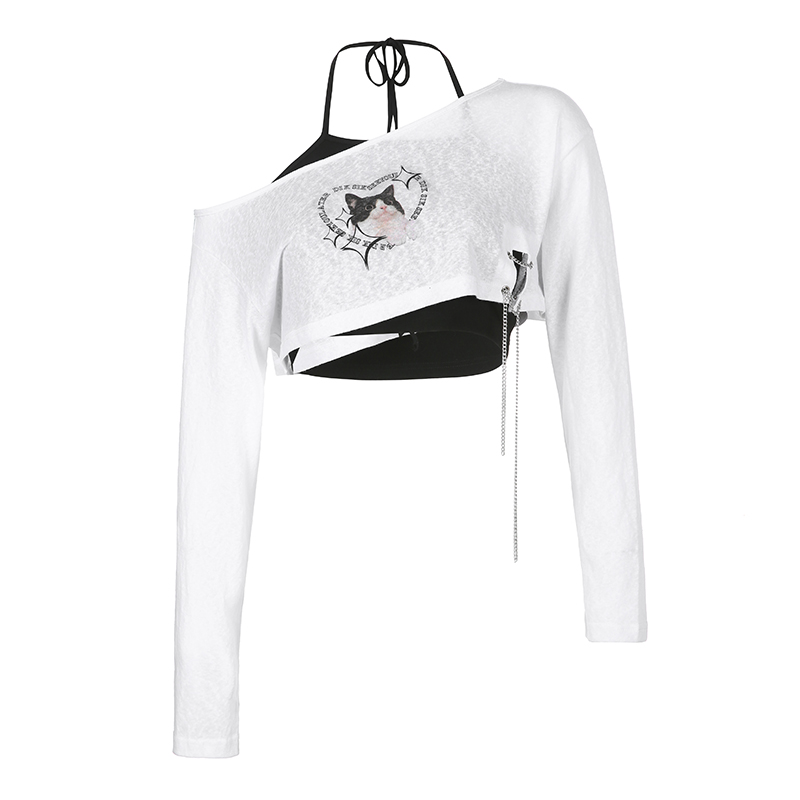 Elevate your wardrobe with our Asymmetrical Shoulder Cat Print T-Shirt and Black Halter Neck Tank Top Layered Two-Piece Set, designed for the trendy Y2K enthusiast. This stylish ensemble features a playful cat print that adds a unique charm, while the flattering fit of the halter neck tank complements all body types. Perfect for casual outings or a night out, this versatile set is a must-have for effortless layering. Don’t miss out on this fashionable addition add to your cart today!