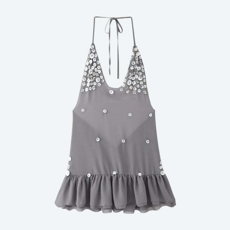 This Backless Button Mini Dress is made for sunset moments and moonlit parties. With sequin-like buttons, a deep plunge, and flirty ruffle hem, it’s your go-to for catching eyes and breaking hearts.