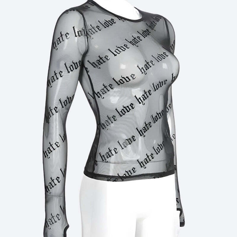 Baddie Love Hate Sheer Mesh Top High-quality product featuring outfit inspo, 90s fashion, coquette outfit and more. Modern design that fits the latest trends. Premium materials ensure durability and comfort. Order now for special offers! Product designed with attention to every detail. Suitable for all occasions and personal styles.