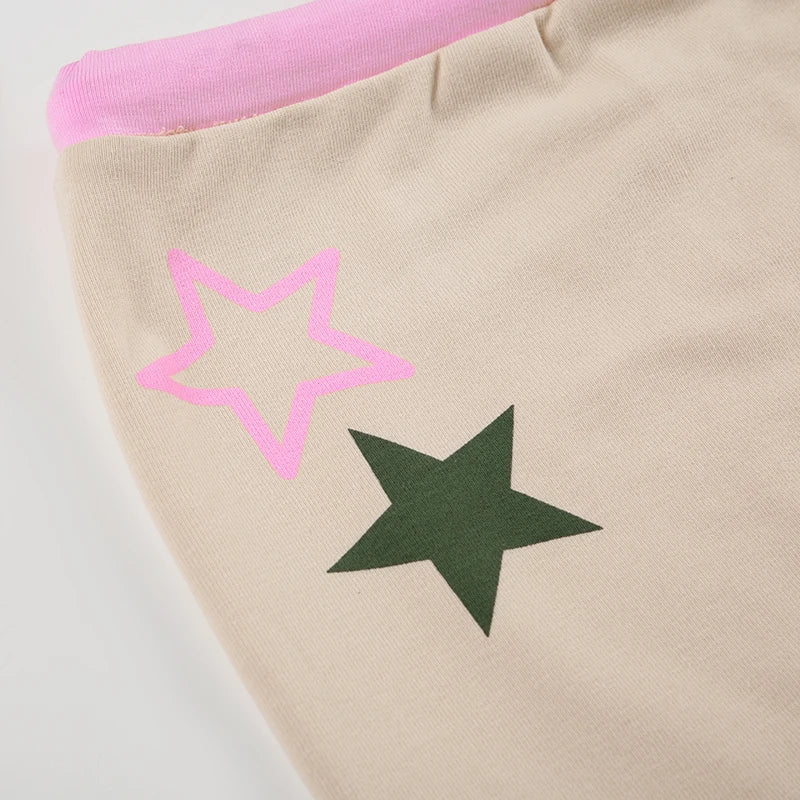 A playful two piece set with a cropped tank and matching mini skirt in soft beige with bold pink trim. The sporty graphics and body-hugging fit bring strong Barbiecore vibes, making it perfect for casual days, parties, or standout streetwear looks.