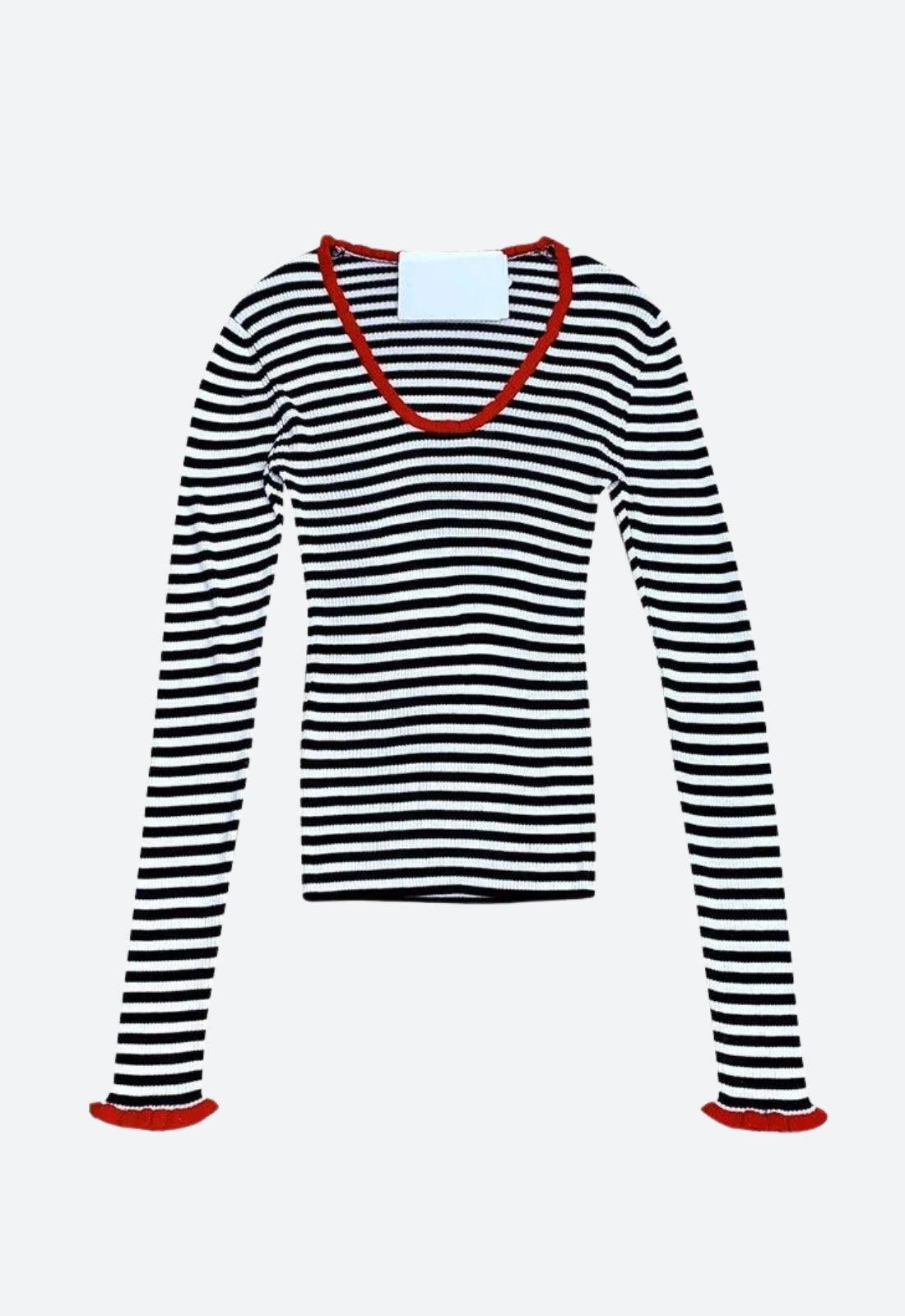 Add a chic staple to your wardrobe with this basic top. Featuring a classic black and white stripe pattern with a vibrant red trim, this top is perfect for both casual and stylish looks. Pair it with jeans or a skirt for a timeless, fashionable outfit.