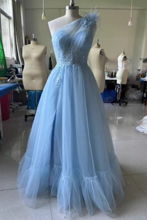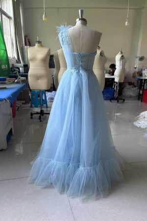 Be the first to review “Blue One-shoulder Feather Wedding Dress” Cancel reply