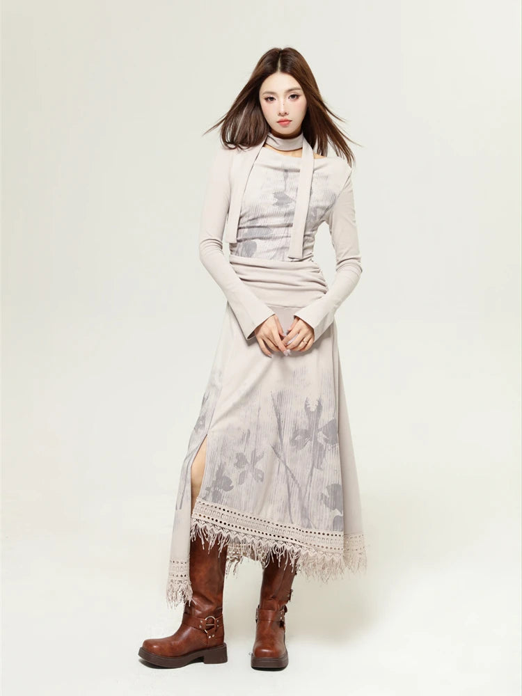 This maxi dress embraces bohemian elegance with its flowing silhouette and intricate fringe hem. The one-shoulder design adds a touch of modern flair, while soft earthy tones create a natural aesthetic. Ideal for casual outings or dressed-up boho vibes.