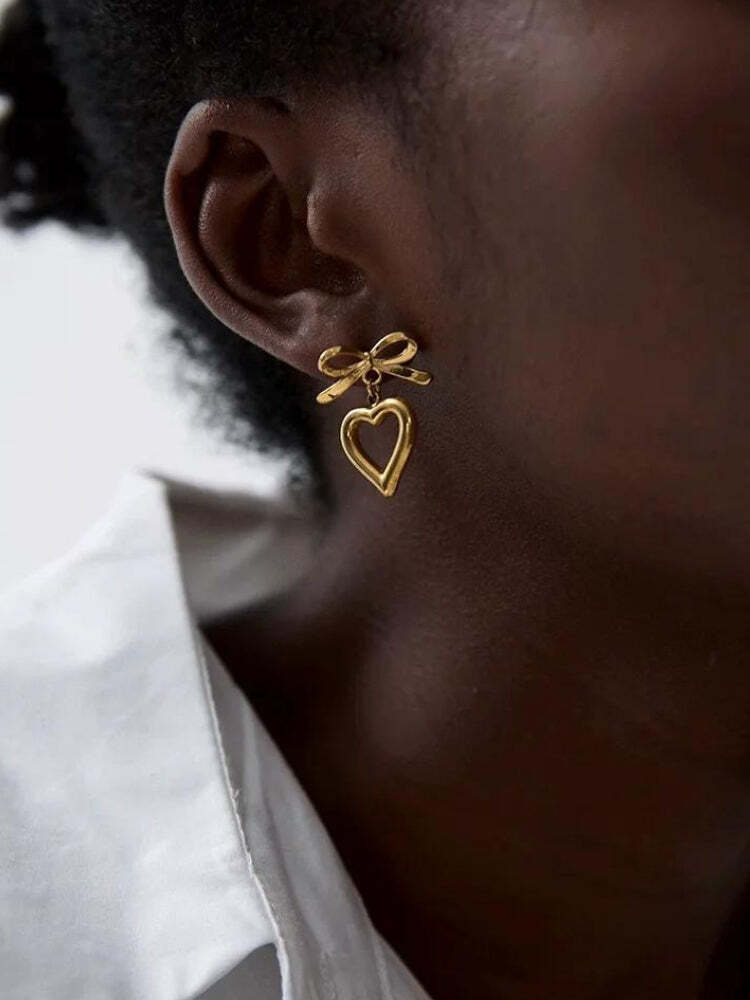 A charming pair of earrings combining elegance and playful design, these accessories feature delicate bows with dangling hearts. Their golden finish adds a touch of sophistication, perfect for both casual outings and special occasions. Lightweight and comfortable, they are sure to become a favorite in any jewelry collection.
