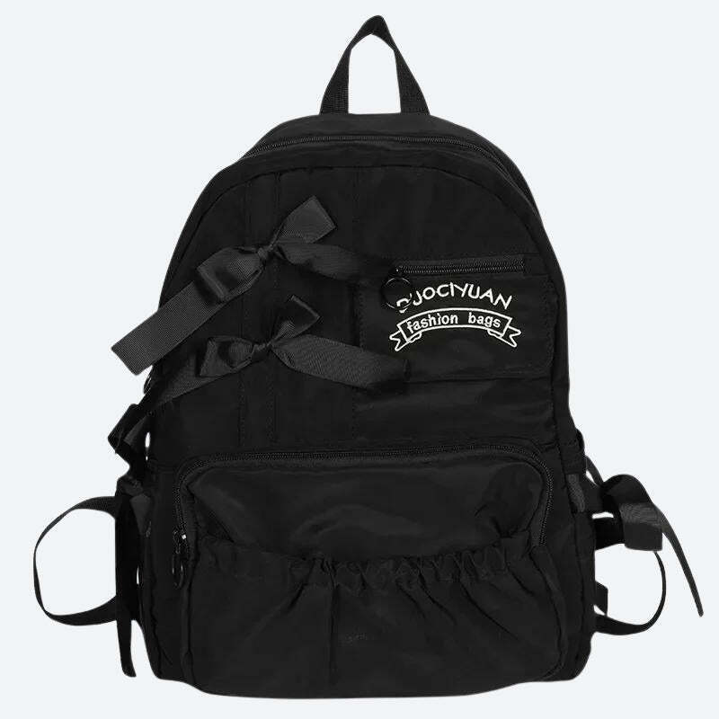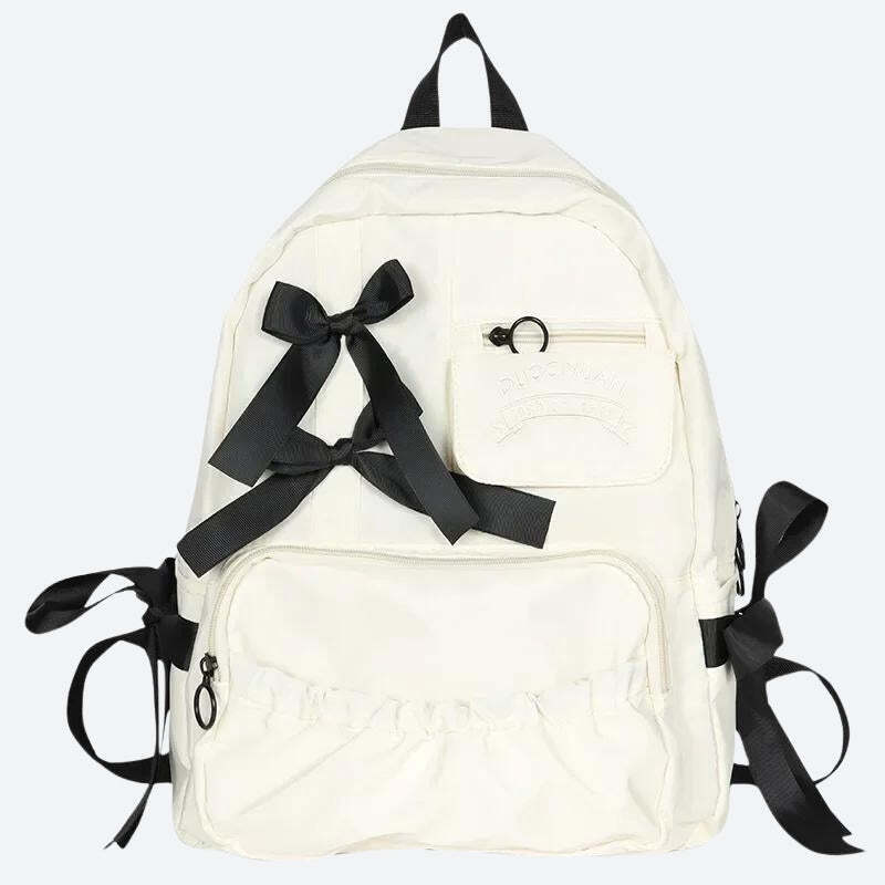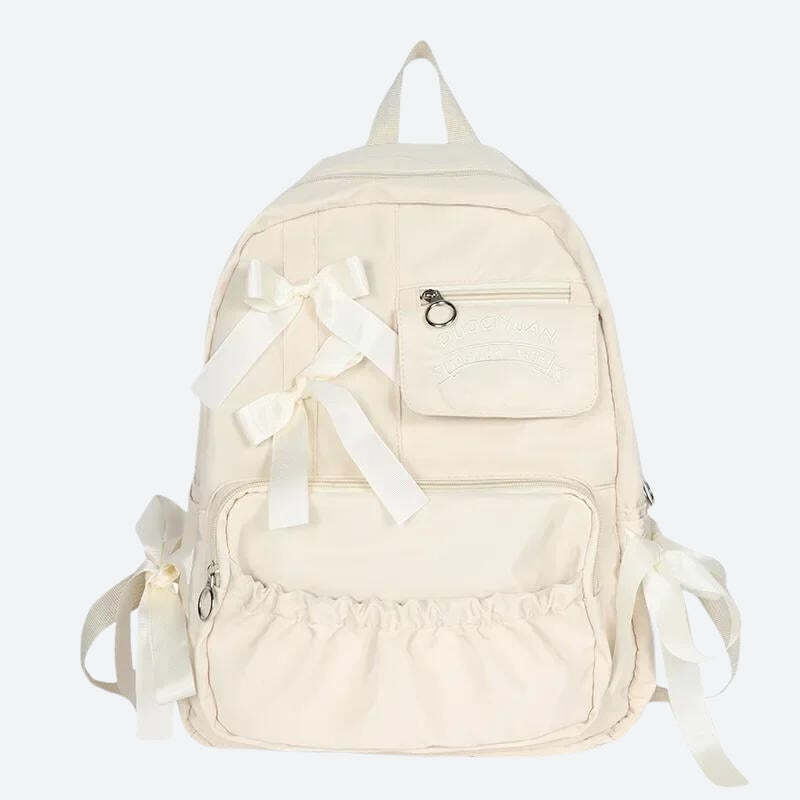 This charming backpack features adorable bow accents, perfect for a cute and stylish look. With multiple pockets for organization, it combines practicality with a soft, feminine touch, ideal for school or everyday use.
