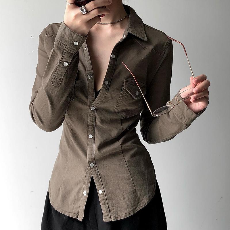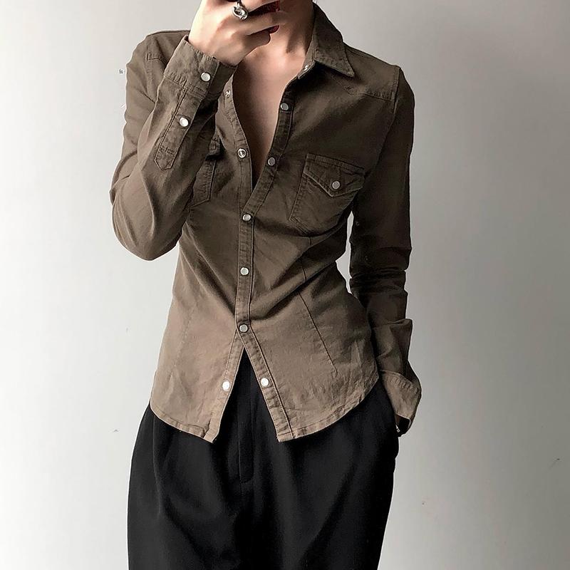 Brown Vintage Lapel Single Breasted Long Sleeve Shirt Women, Slim Fit, Y2K Top Layering, Outerwear High-quality product featuring summer fits, outfit inspo, coquette outfit and more. Modern design that fits the latest trends. Premium materials ensure durability and comfort. Order now for special offers! Product designed with attention to every detail. Suitable for all occasions and personal styles.