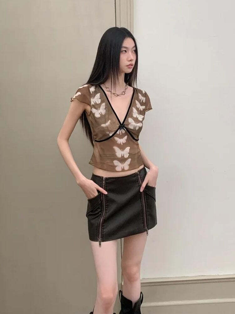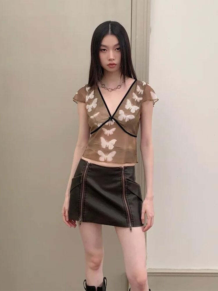 This Y2K Butterfly Top brings nostalgic vibes with its delicate butterfly print on a sheer, lightweight fabric. The deep V-neckline and flutter sleeves add a touch of femininity, while the contrast binding and bow accent elevate the look. Perfect for pairing with mini skirts or high-waisted jeans, this top is a must-have for those channeling early 2000s fashion.