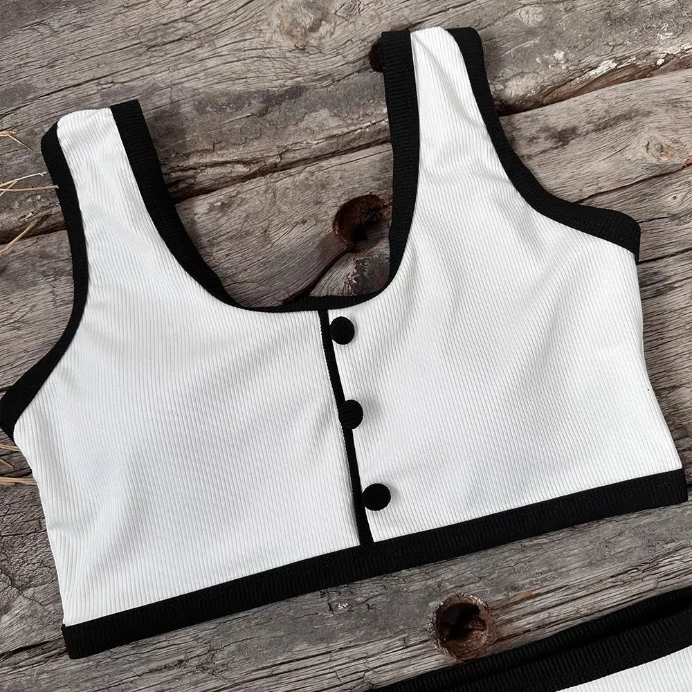 A blend of sophistication and modern design, this bikini set features a button-up front with contrasting trim, providing a sleek and polished look. The high-waisted bottoms and structured top offer both style and comfort, making it an ideal choice for a chic beachside appearance.