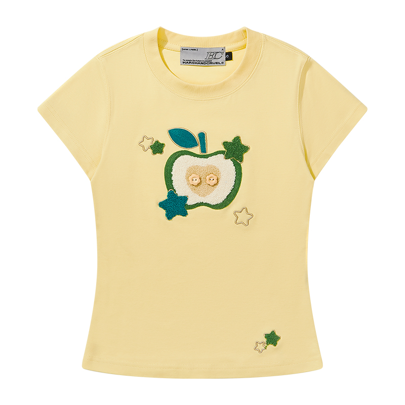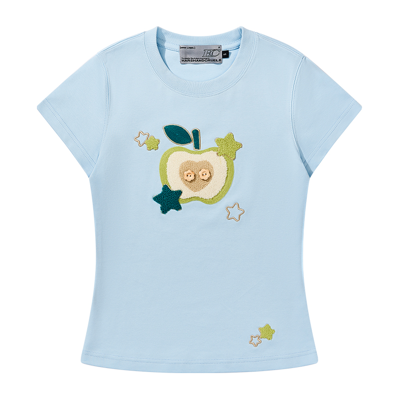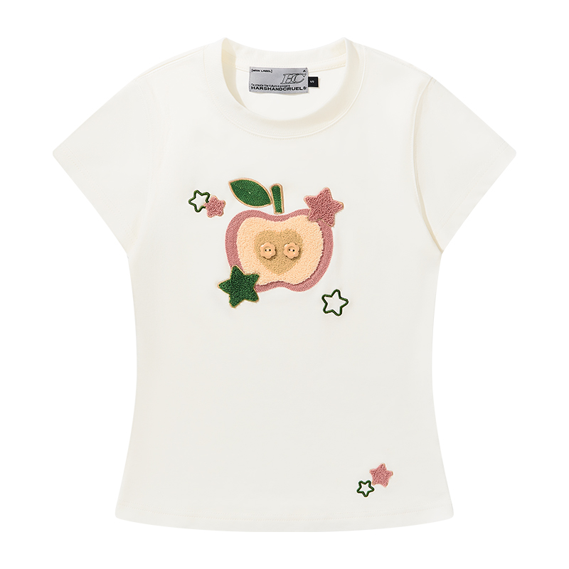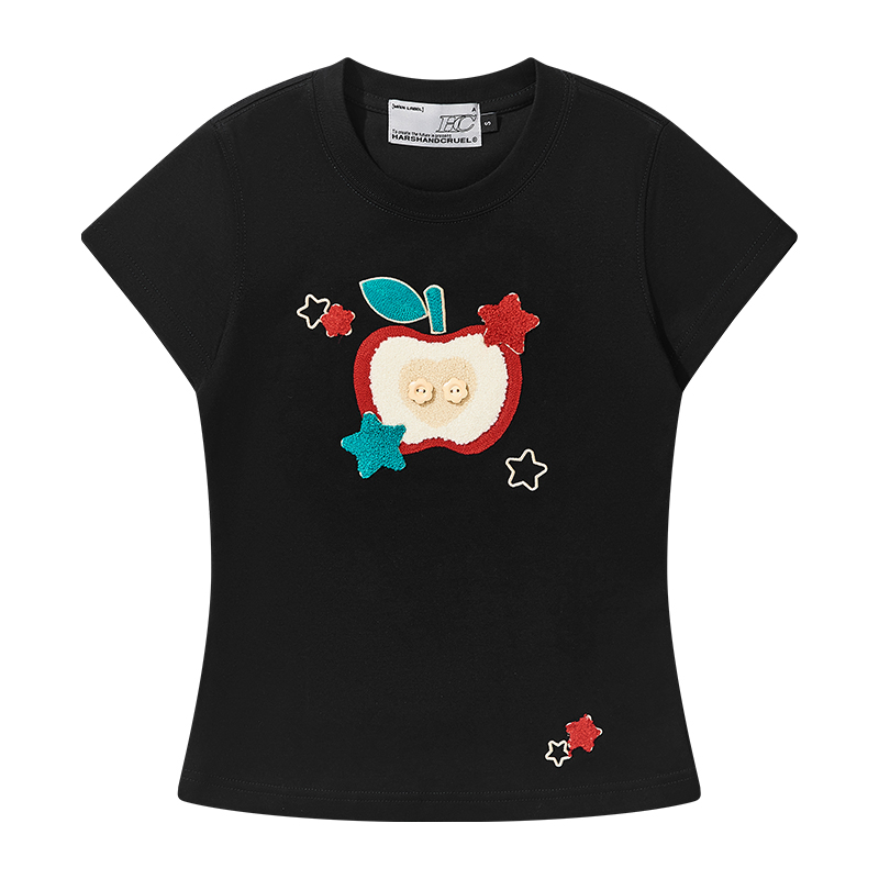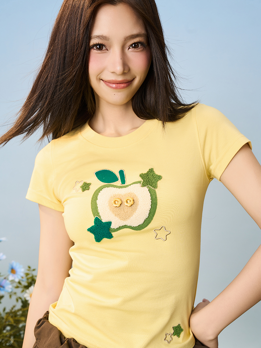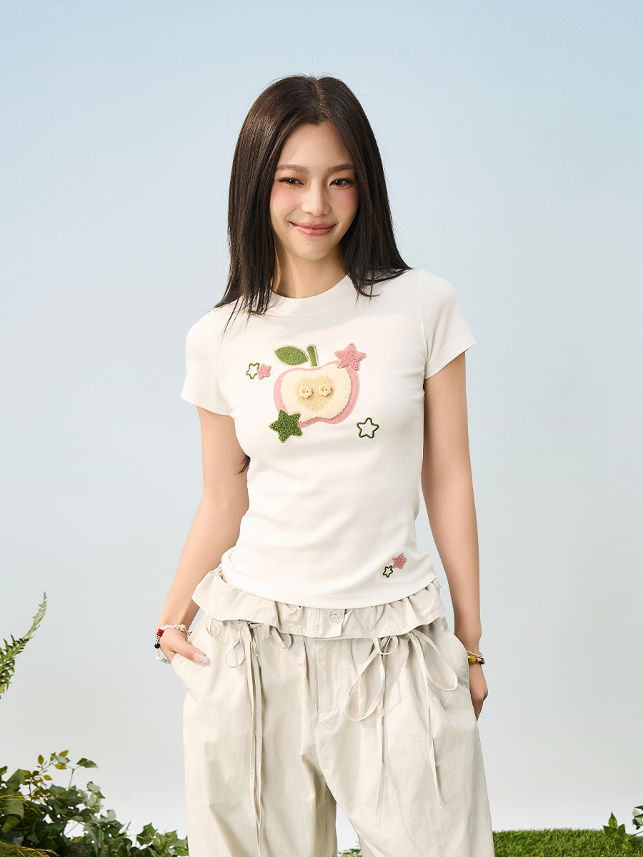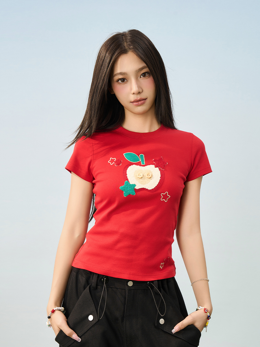 Elevate your casual wardrobe with our Cartoon Embroidered Plush Apple Stretchy Slim-Fit Round Neck Short Sleeve T-Shirt for Women, designed in trendy Y2K style. This t-shirt combines comfort and style, featuring a playful embroidered apple that adds a fun twist to your everyday look. With its stretchy fabric and flattering slim fit, this tee is perfect for layering or wearing on its own. Don’t miss out on this stylish staple add it to your cart today!
