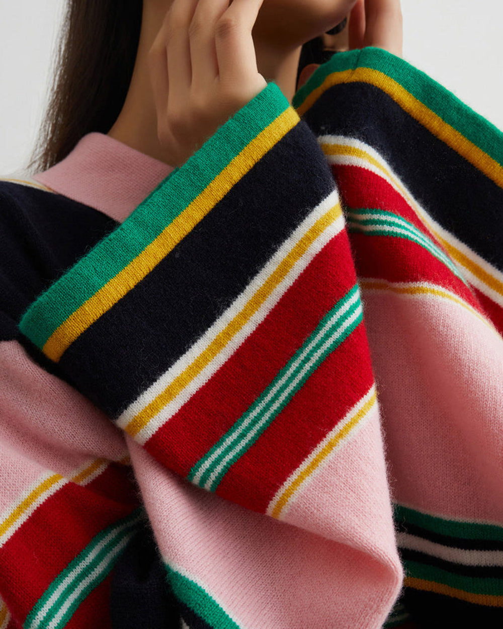 Rugby polo shirt with bold multicolor stripes in pink, red, green, yellow, and navy. Features an oversized fit, dropped shoulders, and a classic collar with a button placket