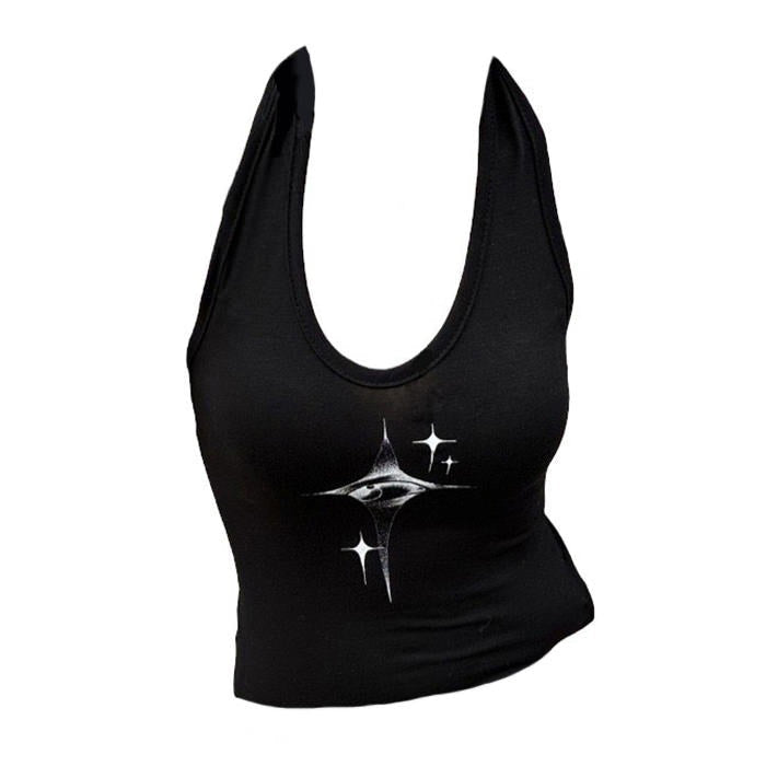 This Grunge Aesthetic black halter top features an eye print, adding a touch of intrigue to your outfit