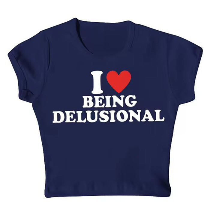 Y2K crop top with ‘I Love Being Delusional’ text on the front
