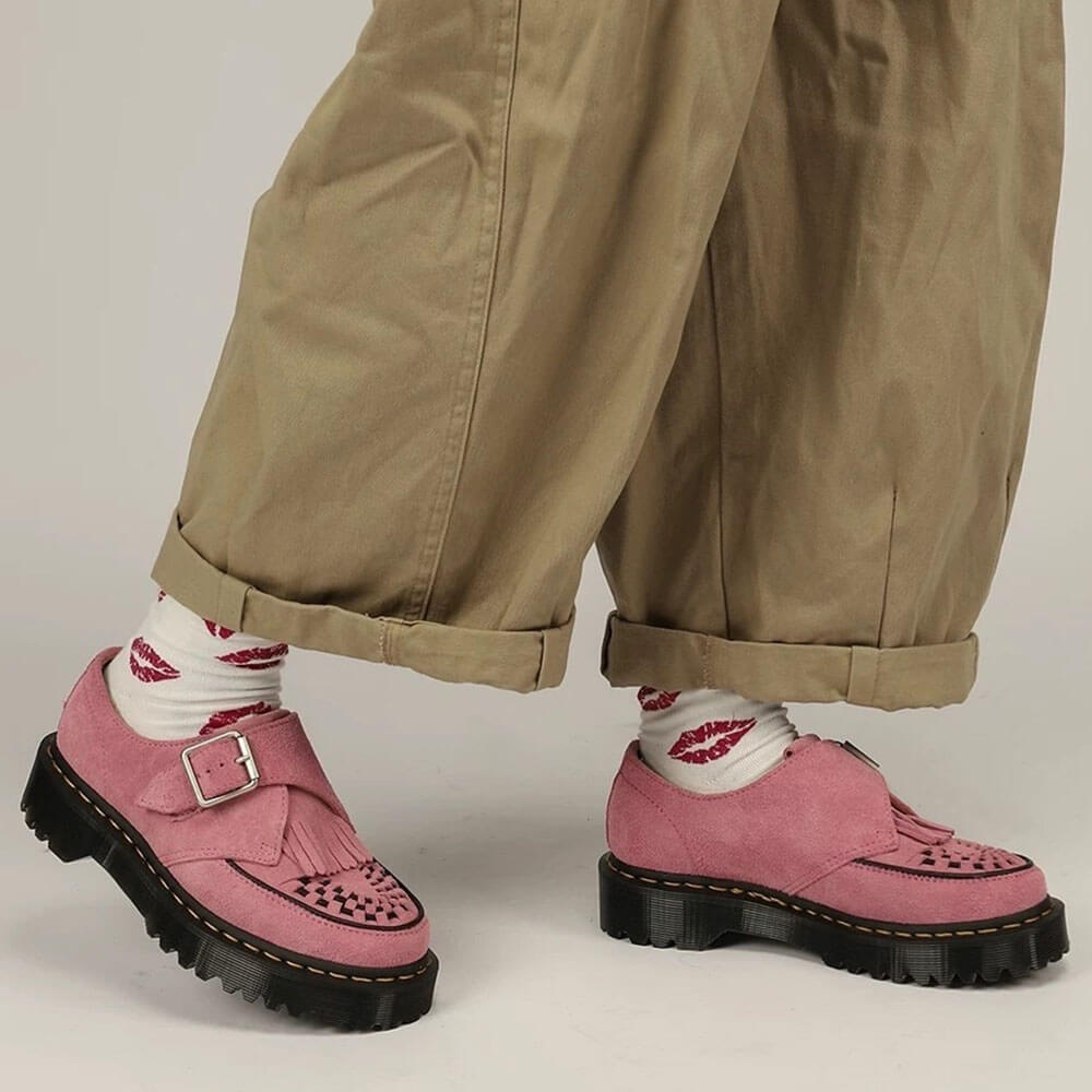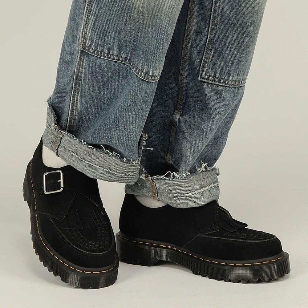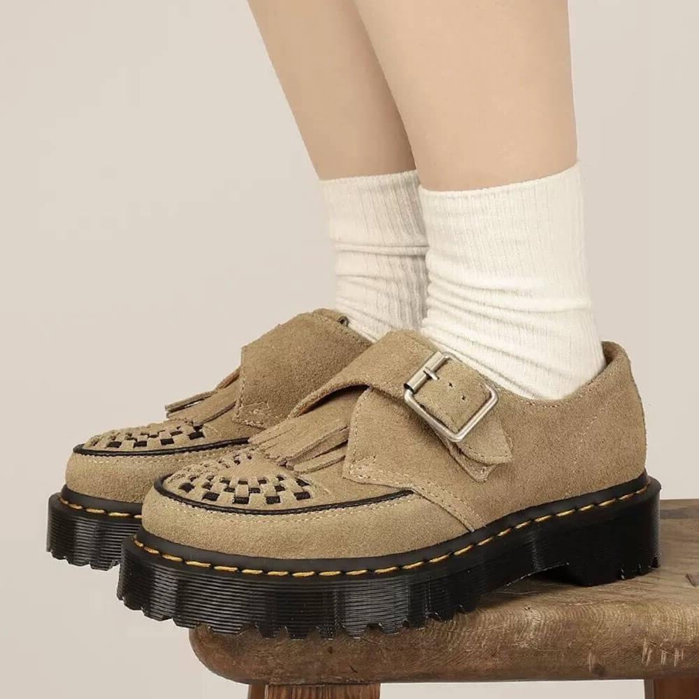 The Fringe Buckle Platform Loafers feature a stylish suede finish with fringe and woven details