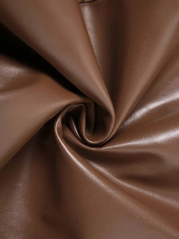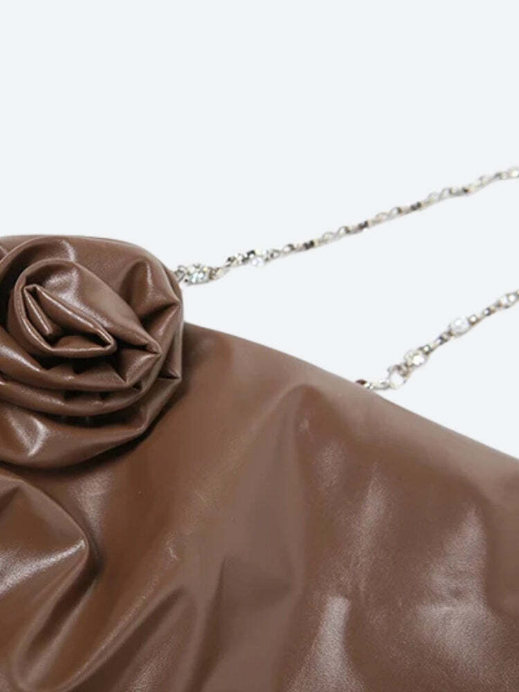 Make a bold entrance in this faux leather mini dress, styled with a body-hugging fit and floral accents. The asymmetric rhinestone chain strap adds serious glam, while the shiny brown finish gives off edgy night-out vibes. Ideal for parties, club looks, or baddie moments.