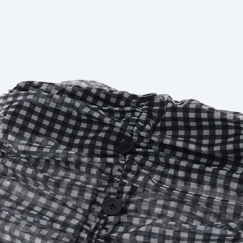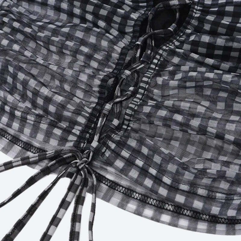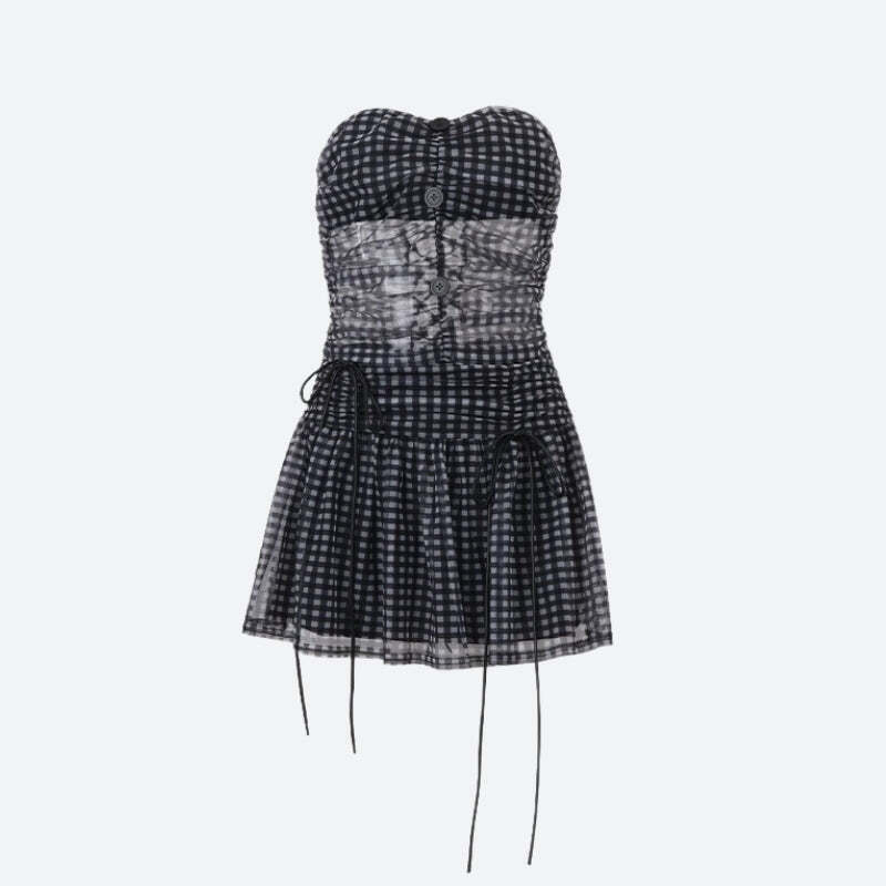 This checkered strapless set is a bold pick for parties or late-night hangouts. The sheer ruched top and flirty mini skirt bring youthful vibes, while adjustable ties ensure a snug fit.