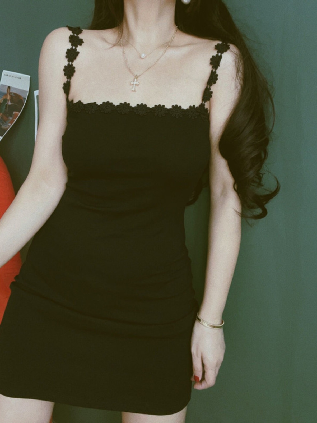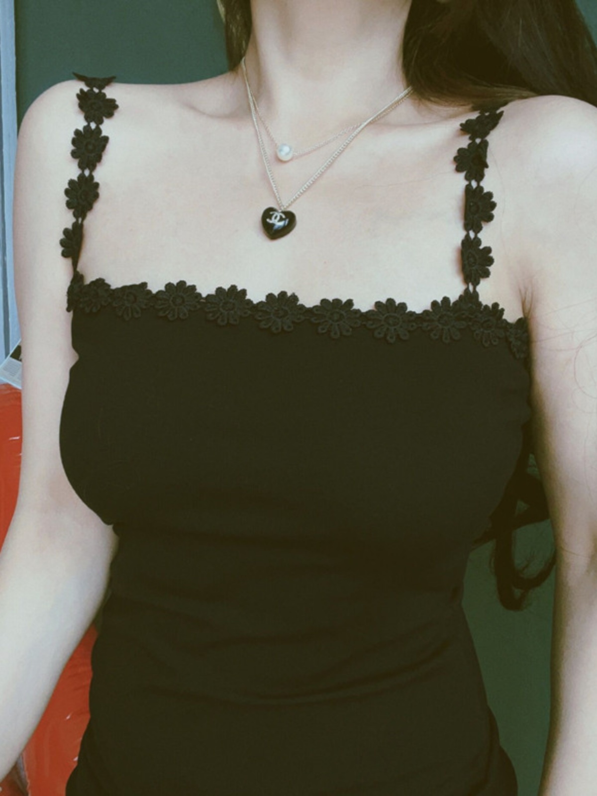 Chenopod Flower Shoulder Strap Black Camisole Dress Pring/summer Lace – Hoco Dresses
