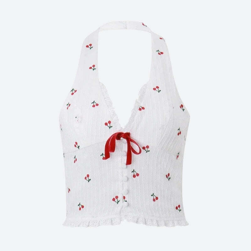 Get a sweet style with this soft girl cherry halter neck top. The playful cherry print, tie-front design, and lace trim create a youthful vibe for everyday wear or weekend dates.