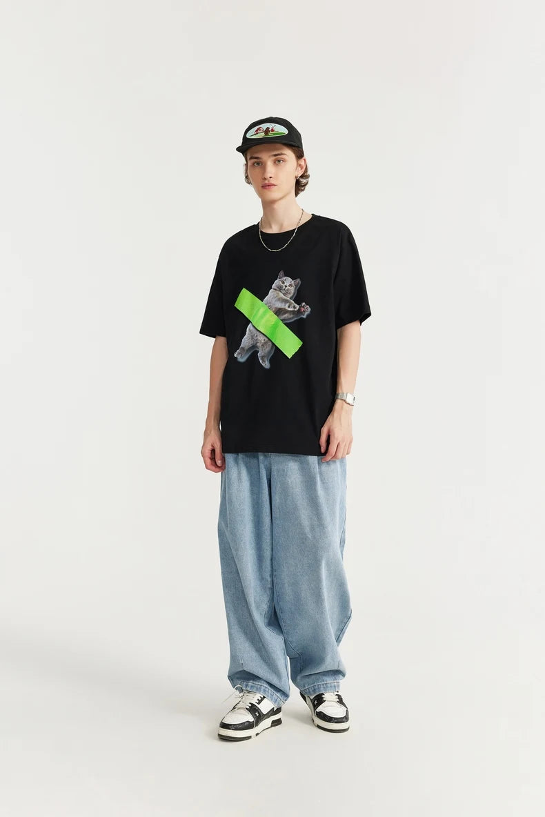 Add a playful touch to your wardrobe with this tee. Featuring a quirky cat graphic with vibrant colors, this oversized T-shirt offers both comfort and style. Made from soft, breathable fabric, it’s perfect for casual outings or lounging at home. Pair it with jeans or shorts for an effortlessly cool look.