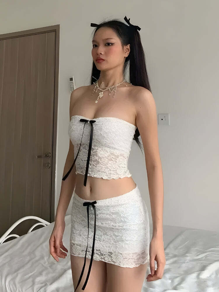 Chic Coquette Outfit: Bow Lace Two Piece Set for Effortless Style