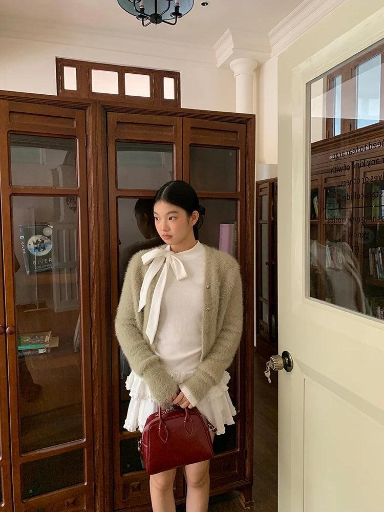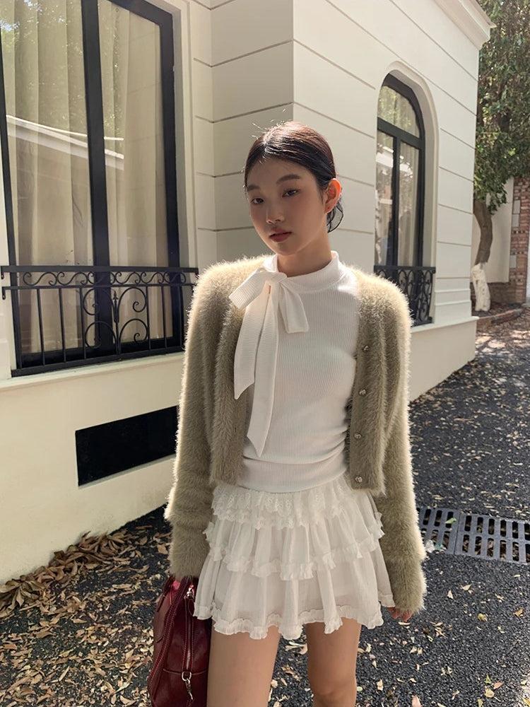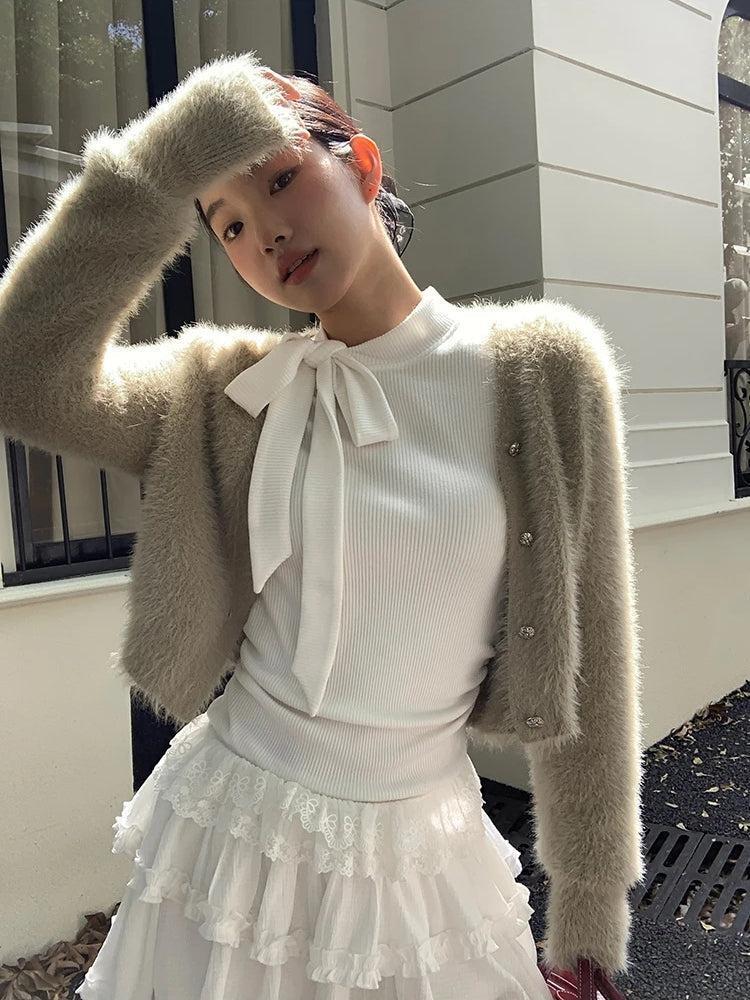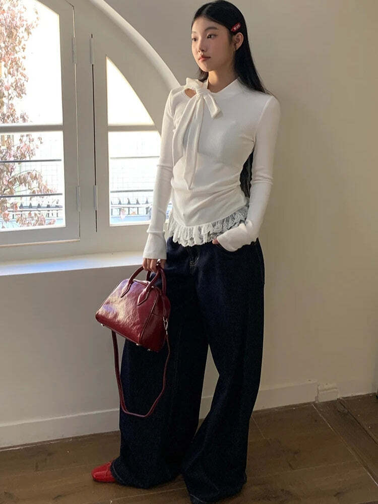 This soft white knit blouse blends sweetness and structure with its oversized bow neckline and lace hem. Fitted through the body, it’s designed to flatter while keeping your look delicate. A soft girl essential that pairs well with denim or midi skirts.