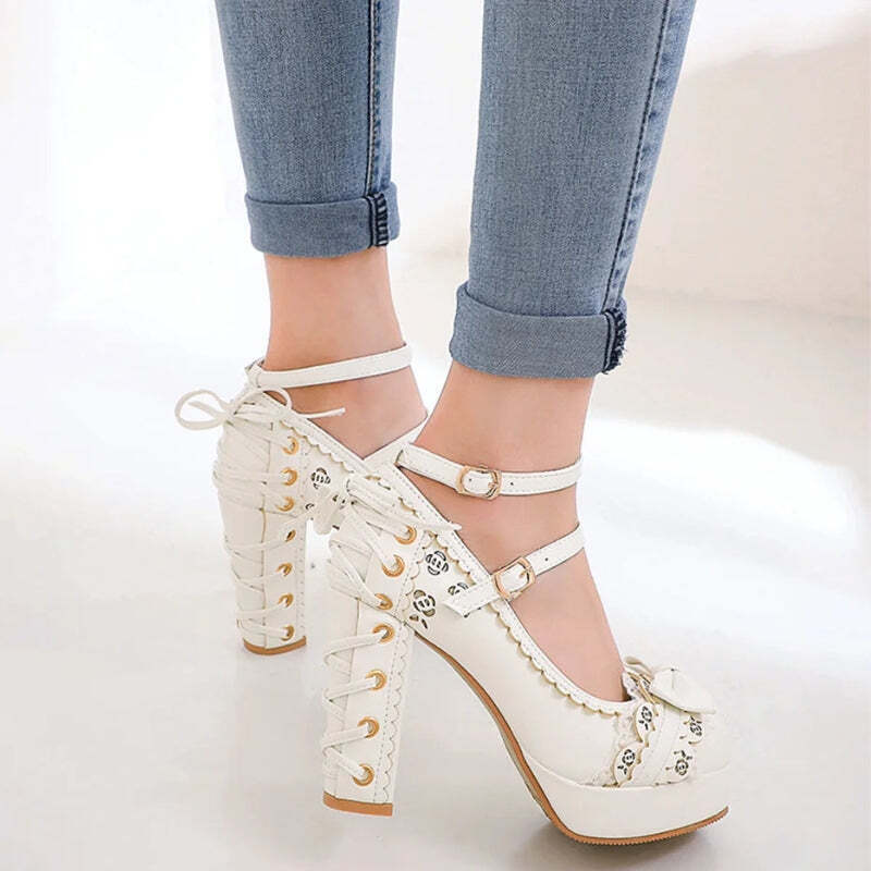 Try these coquette lace-up high heels for a sweet, flirty vibe. Their layered laces and chunky heel bring playful charm to parties or date nights. The pink shade and adjustable straps ensure a comfy, statement look.