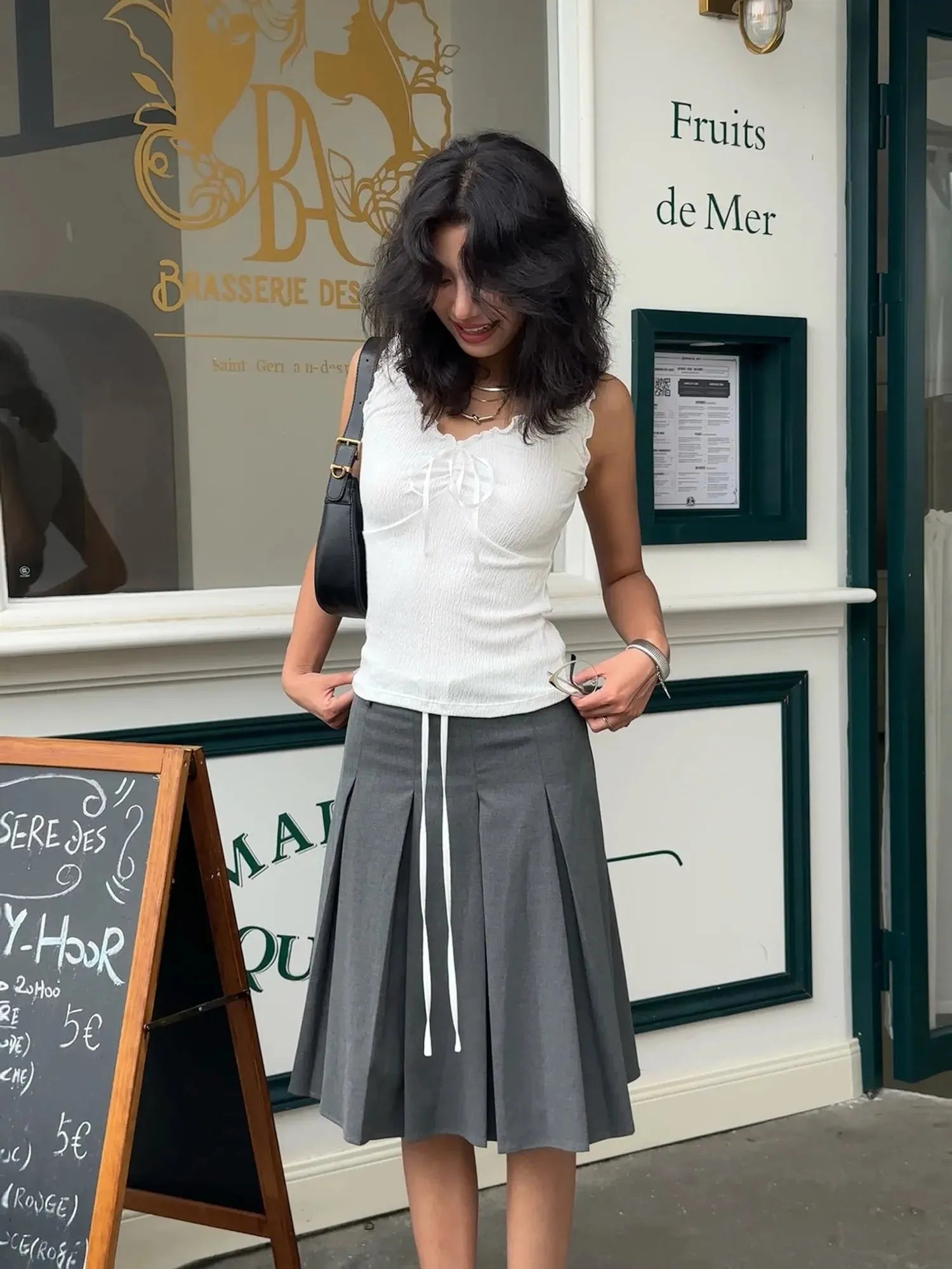 Ruffled edges and a tie-up front meet soft, stretch-kissed texture for a top that blends girly charm with casual flair. Fitted to flatter and easy to pair with low-rise skirts or wide-leg jeans, it’s a go-to look for café dates, gallery strolls, or snapping pics with a soft-grunge filter.
