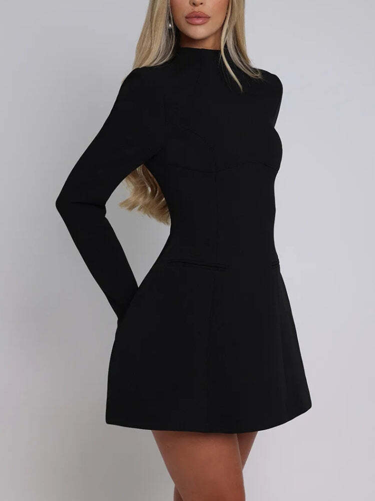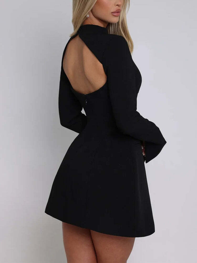 This cut-out open-back mini dress is all about bold elegance. The structured silhouette flatters your figure, while the long sleeves balance the daring backless design. A must-have for nights out or special occasions.
