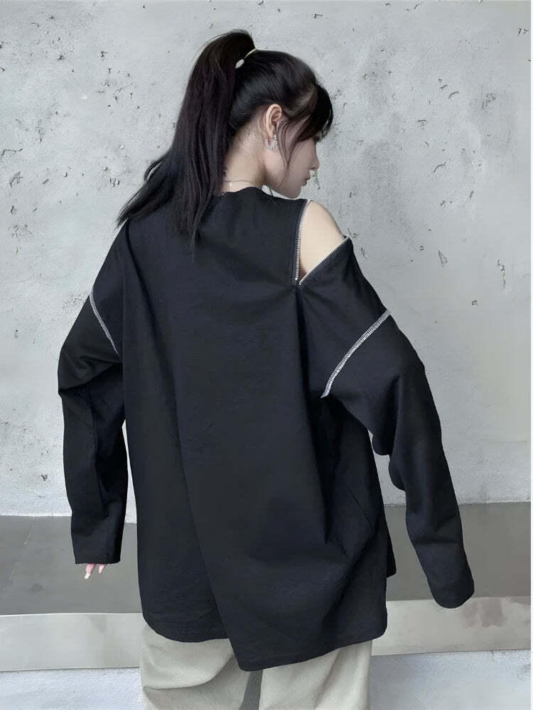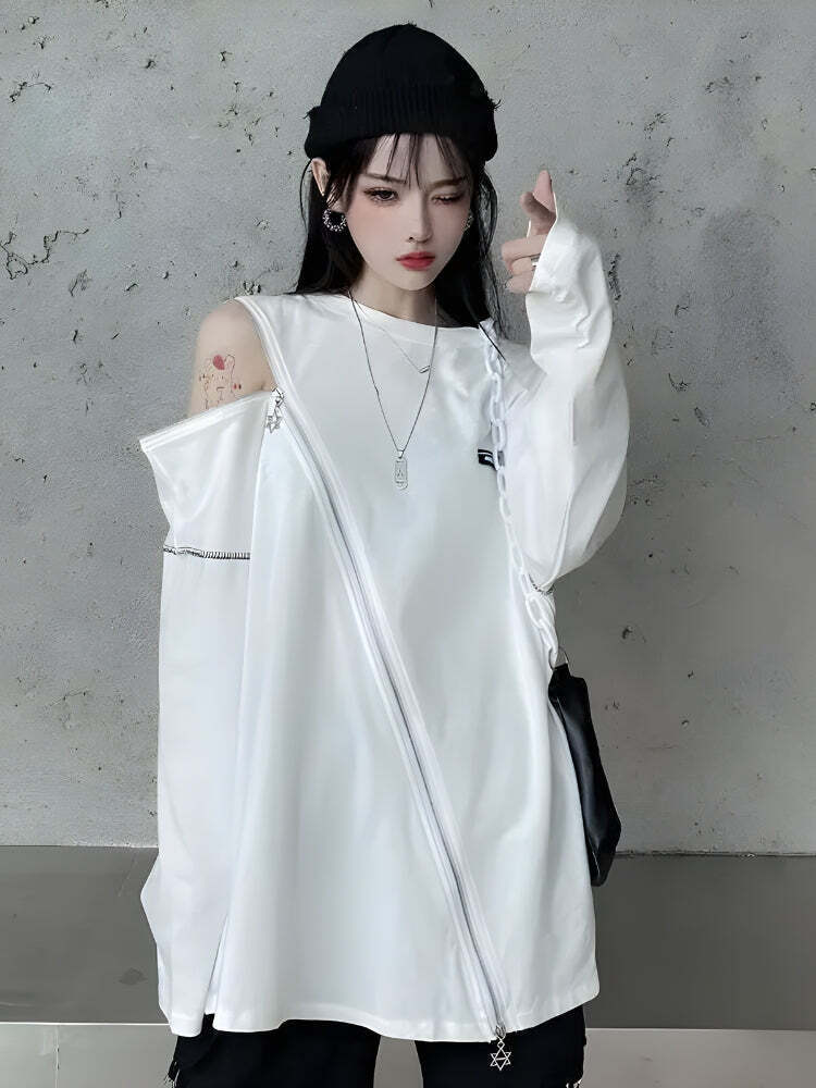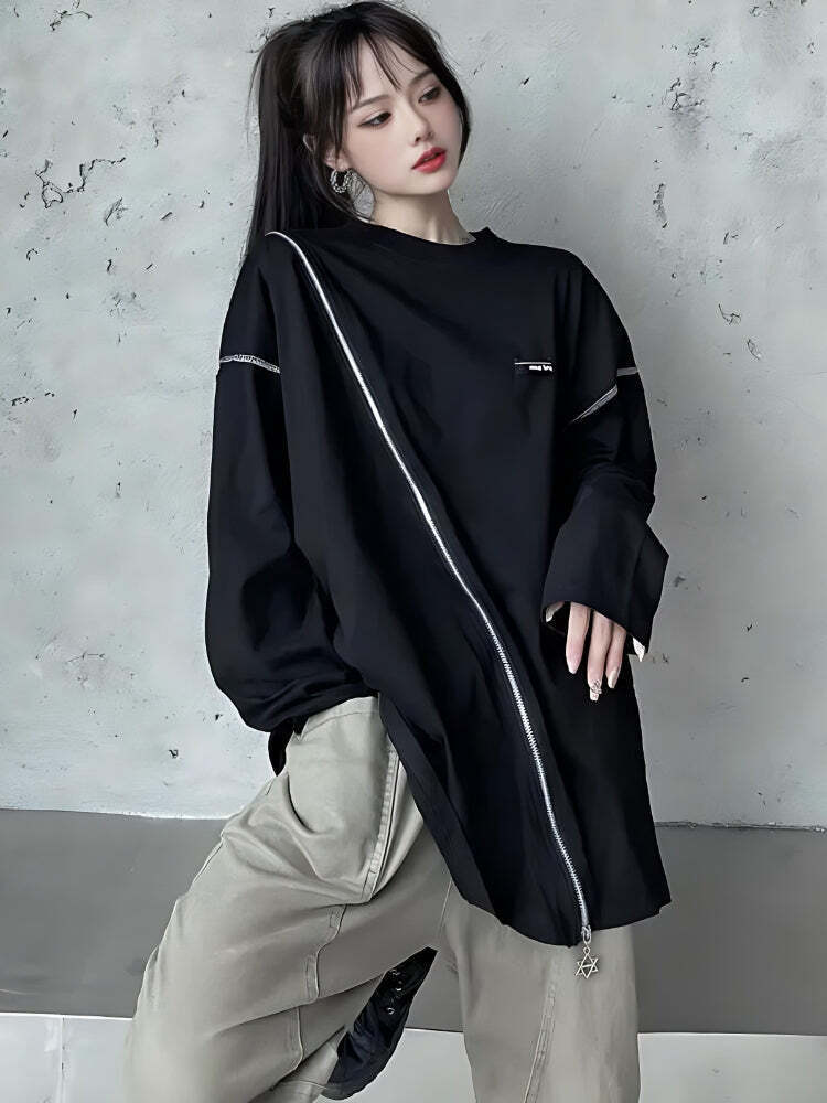 Immerse yourself in the cyberpunk world with this unique top, featuring a cross double zip fastening and contrast sewing details. The crew neck and long sleeves make it a versatile unisex piece, perfect for a streetwear look that’s cool and distinctively unique.