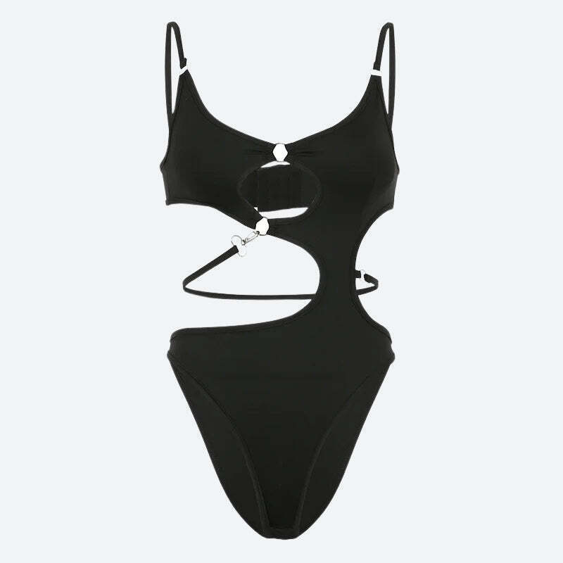 Serve fierce futuristic vibes in this daring black bodysuit. Featuring asymmetric cut-outs, O-ring detailing, and a high-leg silhouette, it’s designed to sculpt your curves and command attention. Whether you wear it solo or layer it under cargos or a sheer skirt, it’s made for main character energy.