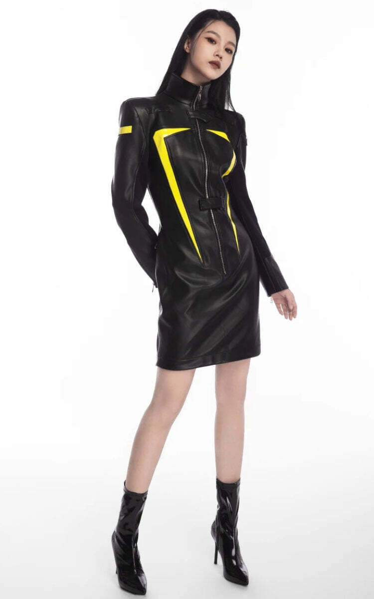 Command the scene with this cyberpunk faux leather maxi dress. Structured shoulders and bright stripes exude futuristic vibes. A belted waist and flared hem deliver edgy flair for party nights or cosplay.