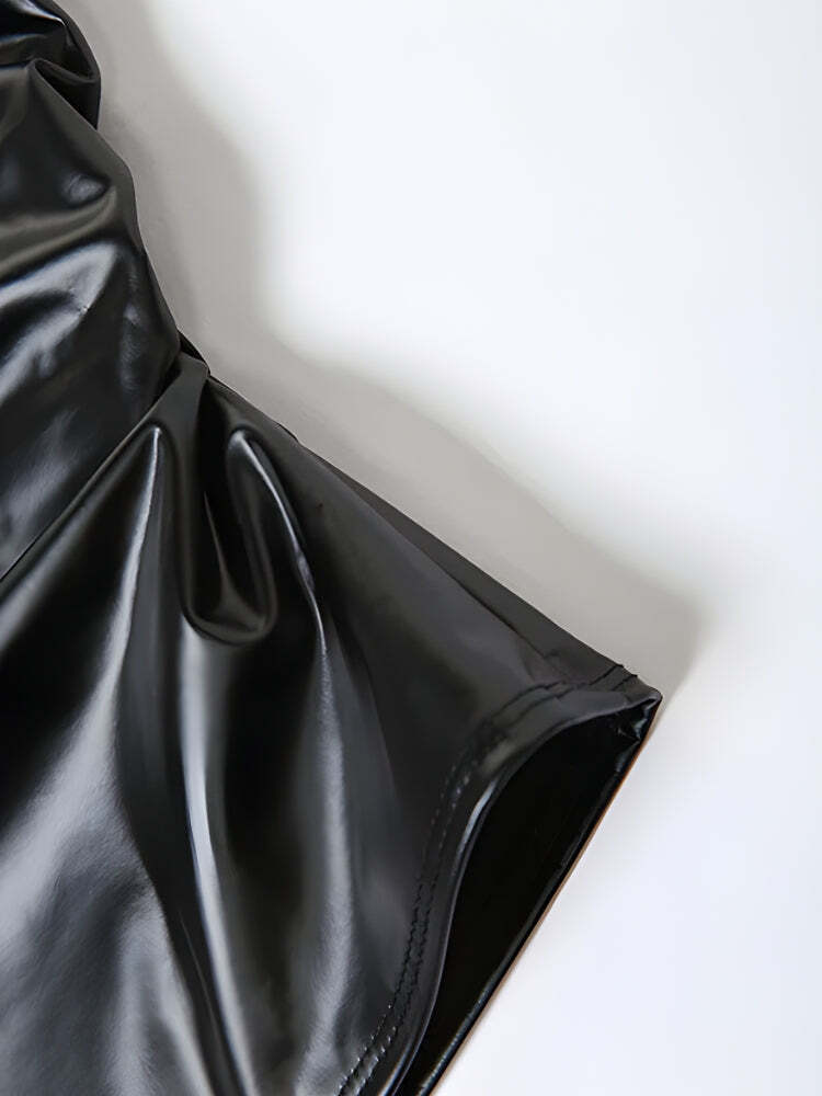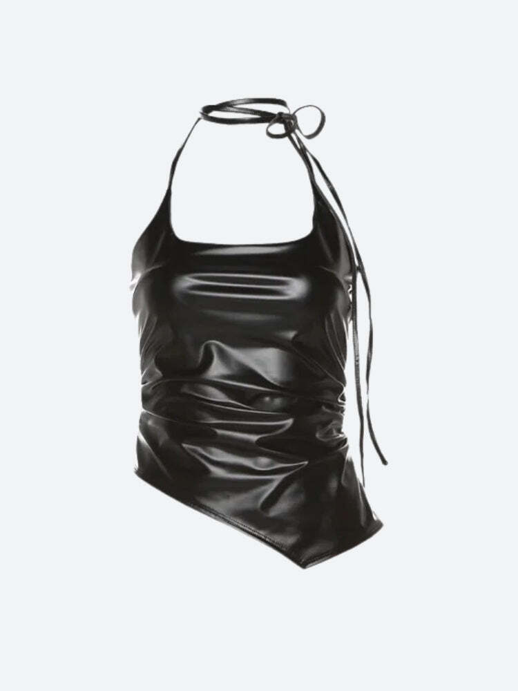Sleek and bold, this halter neck tie top levels up your alt wardrobe. Crafted from glossy stretch fabric, it hugs the body with a ruched finish and edgy shine. The adjustable neck tie adds attitude and comfort, making it a standout piece for night looks, rave fits, or cyberpunk-inspired streetwear.
