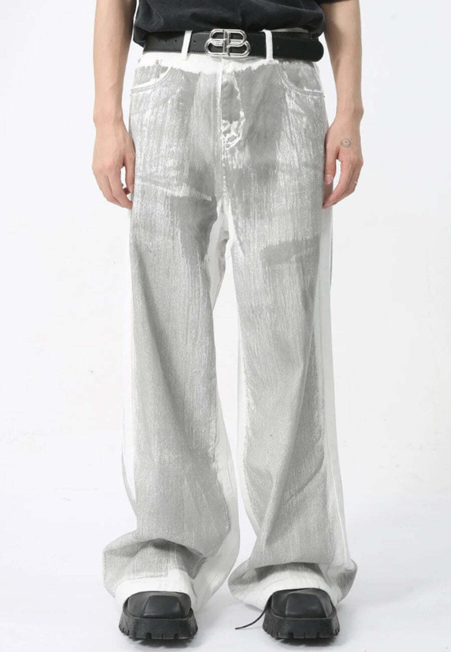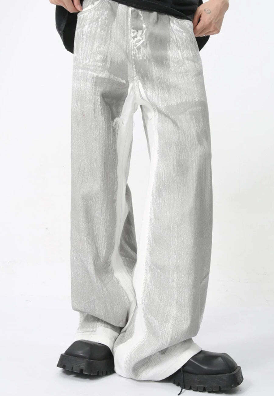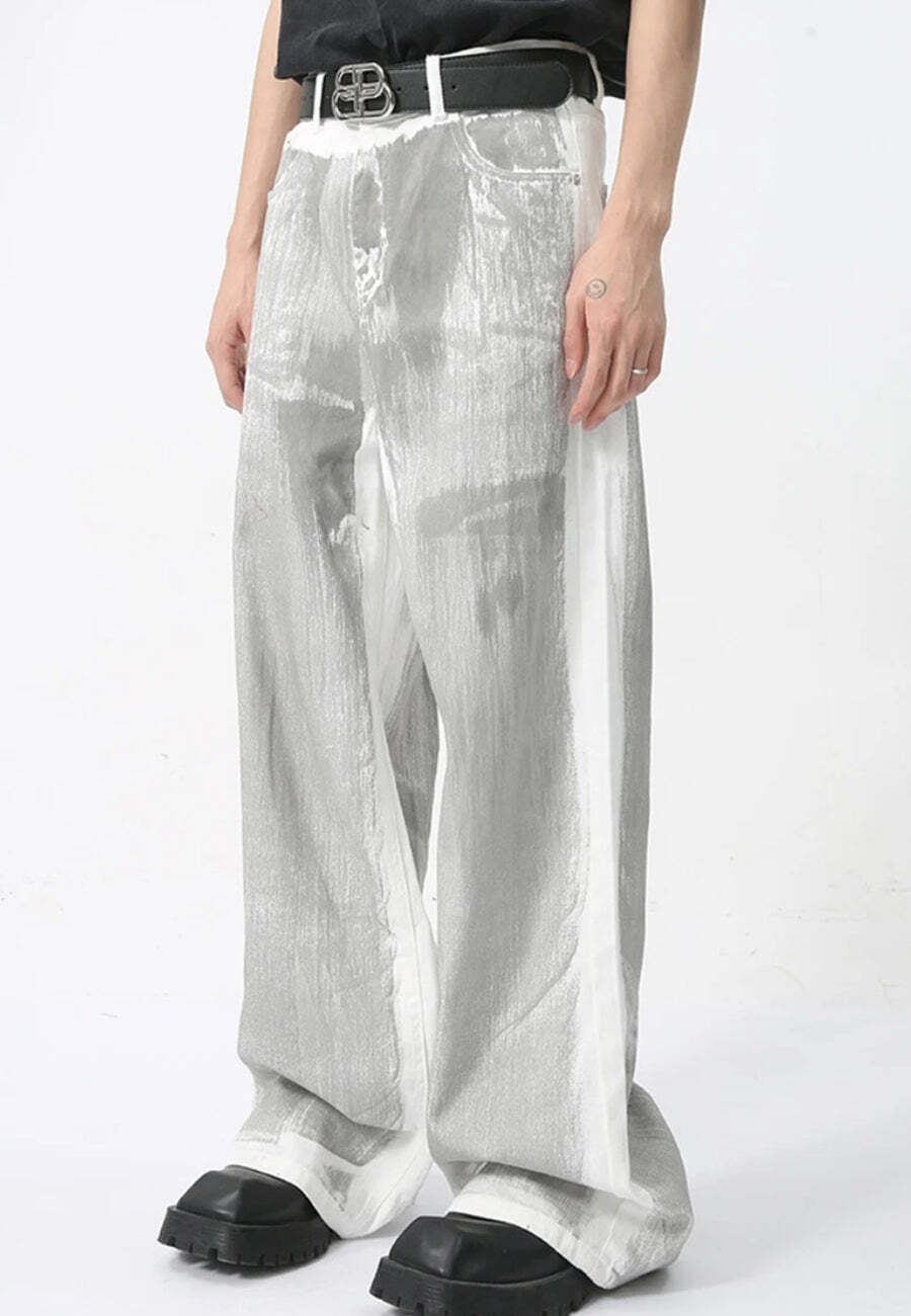 Cyberpunk Silver Pants that bring the future to your fit. These metallic wide-leg jeans reflect major Y2K-meets-techwear energy with a brushed foil texture and bold oversized silhouette. Perfect for nightlife, raves, or standout streetwear moments.