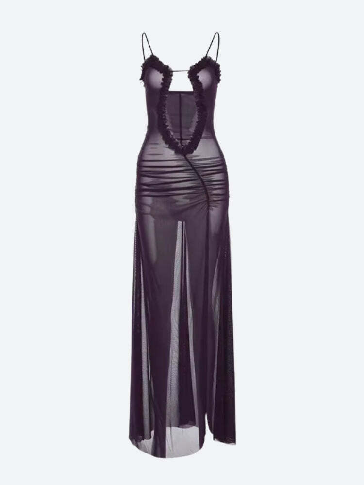 This deep plunge slit maxi dress brings sultry elegance with its daring neckline and flowing silhouette. The lace-trimmed details and high slit add a bold touch, while the lightweight fabric drapes beautifully. Perfect for evening events or statement looks.
