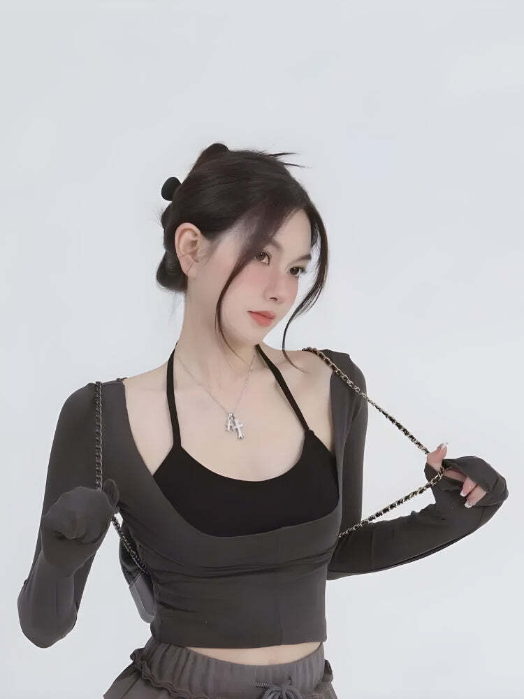 This two-piece set includes a cropped top with a halter strap, offering a stylish solution for casual, streetwear, or party occasions. Its deep scoop neck design makes it a trendy choice for those looking to make a fashion statement.